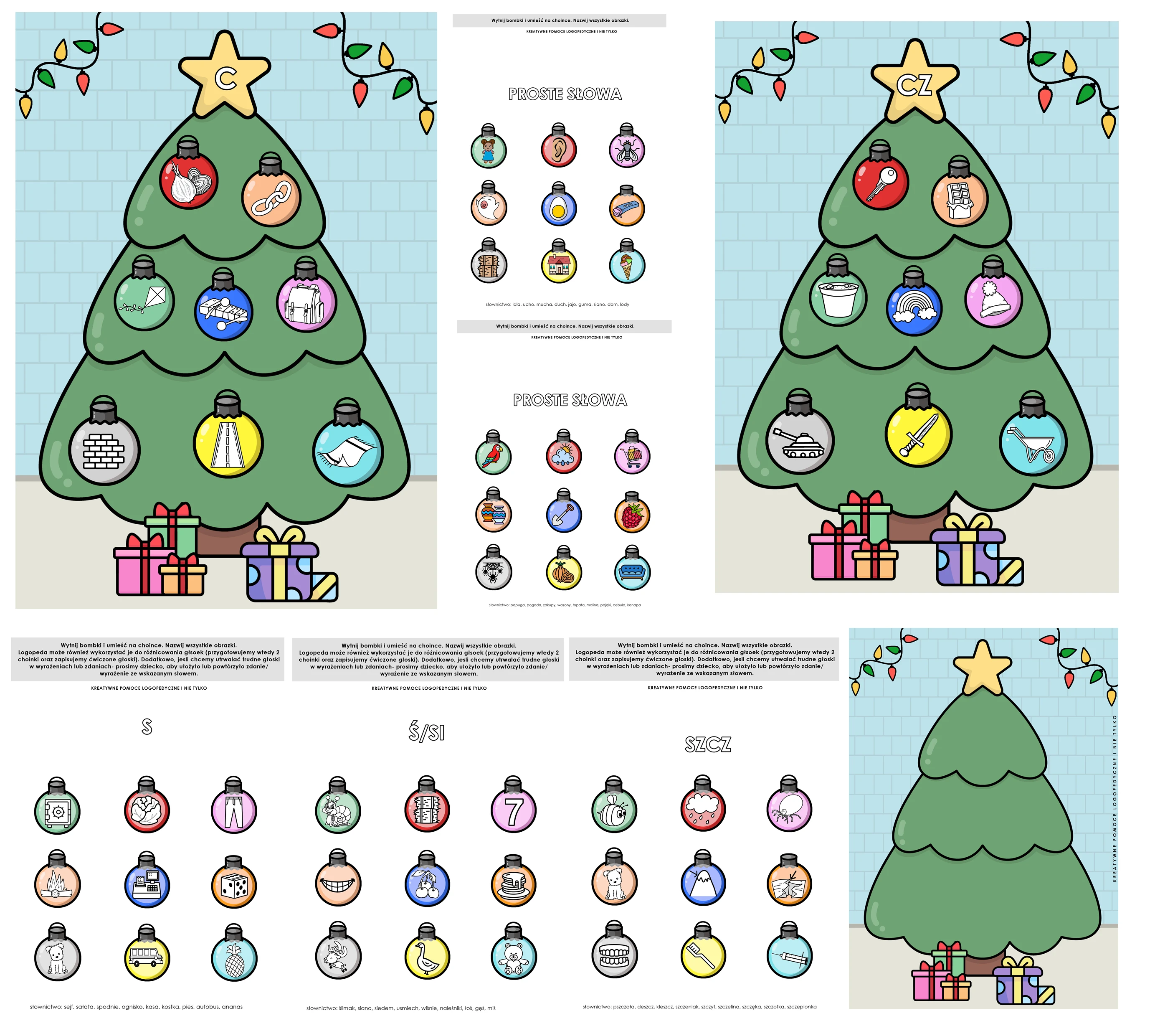 Choinki i bombki to zabawa do utrwalania i różnicowania głosek oraz nauki prostych słów.