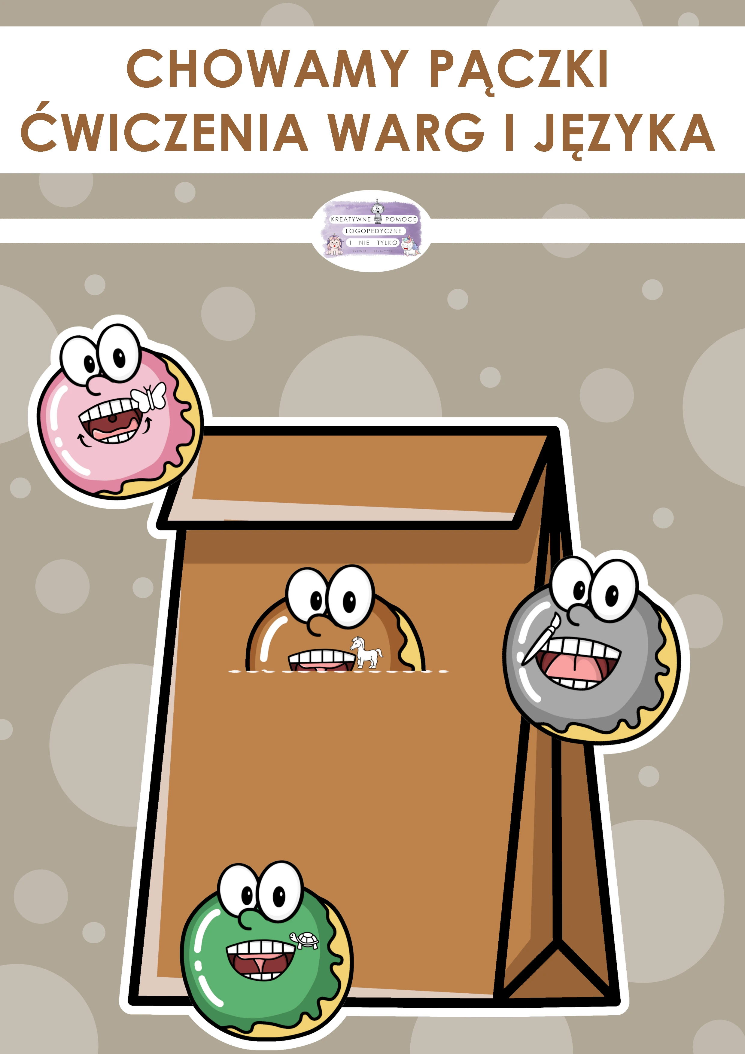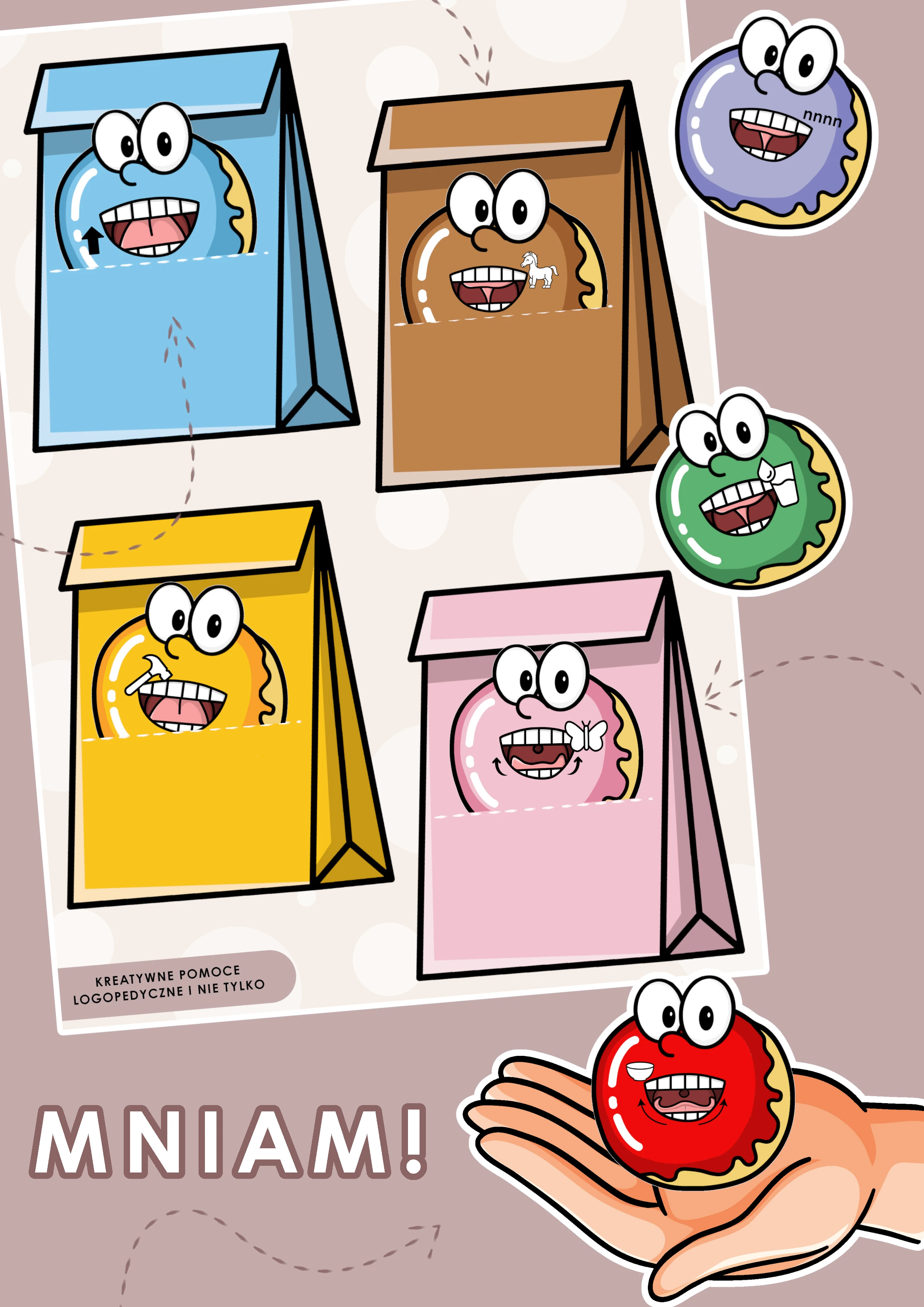 Ćwiczenia narządów artykulacyjnych z pączkami, które należy dopasować do toreb i schować. W zestawie znajduje się opis wszystkich ćwiczeń.