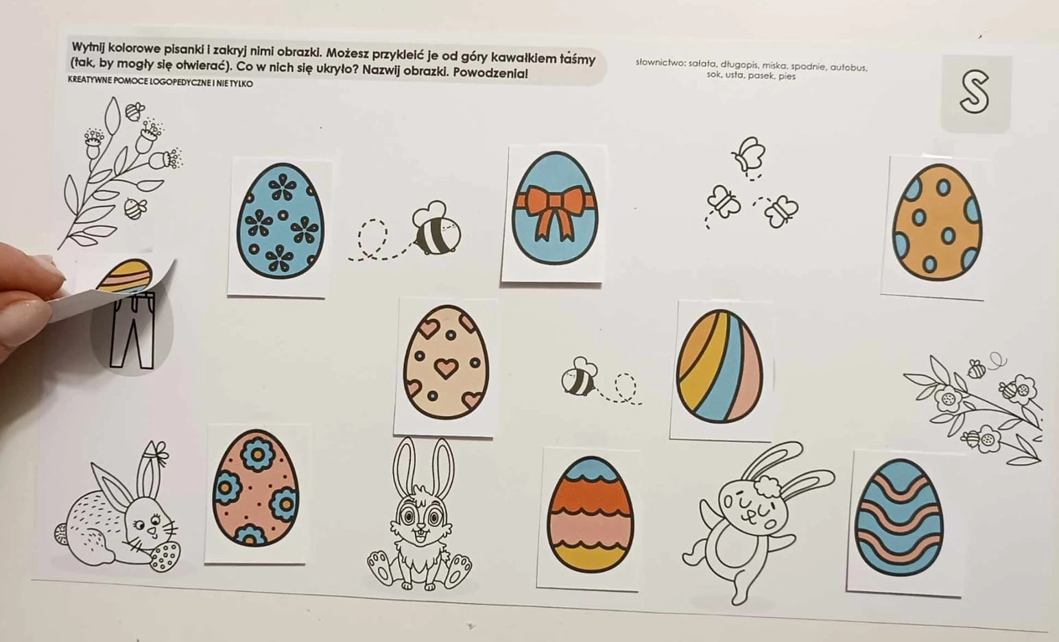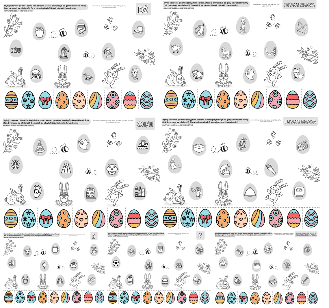 Zestaw kolorowych kart z pisankami, które można otworzyć. W środku znajdują się głoski do utrwalania:
