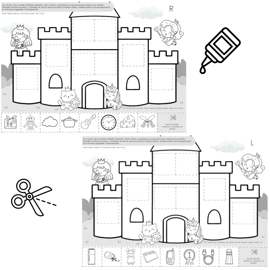 Można wydrukować pojedynczą kartę z ćwiczoną głoską lub dwie karty z głoskami opozycyjnymi- do ich różnicowania. Wycięte obrazki chowamy w misce sensorycznej lub po prostu losujemy i przyklejamy w wyznaczonym miejscu.