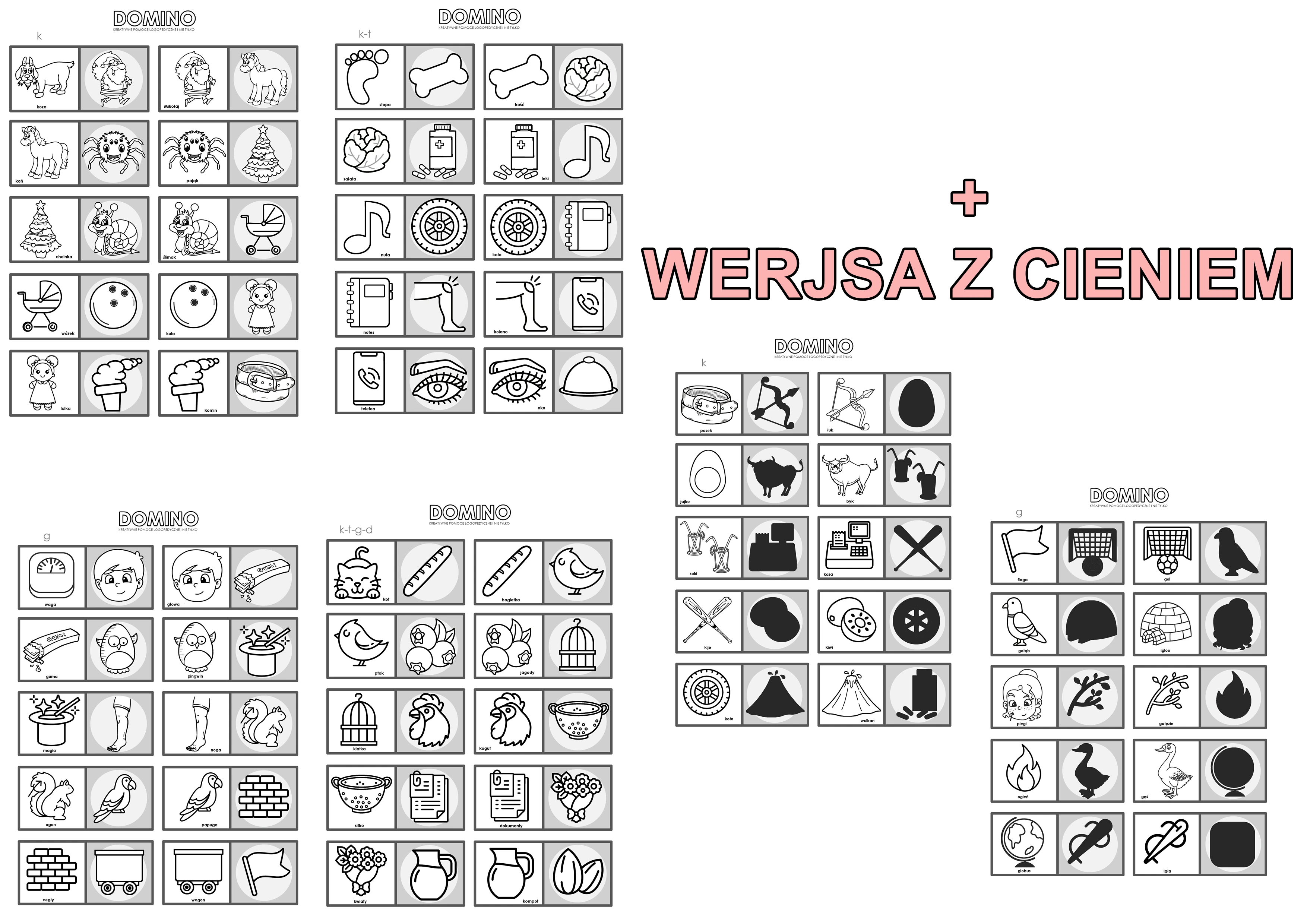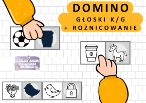 Domino to znana i lubiana zabawa w wersji czarno-białej z głoskami /k/ i /g/ oraz ich różnicowaniem. Starannie dobrane słownictwo- bez głosek szumiących i głoski /r/.
