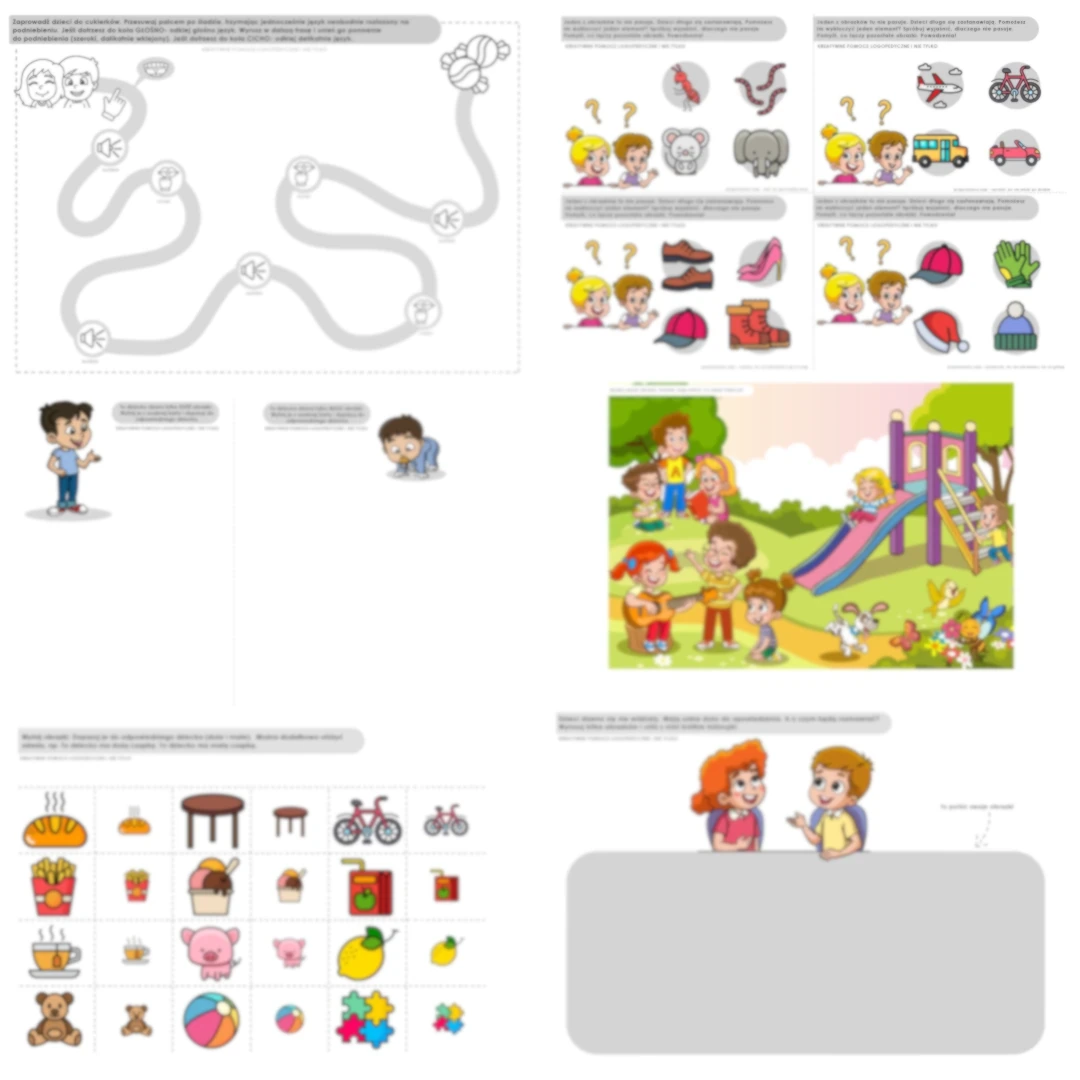 - Zabawy rozwijające- aktywności, które urozmaicą zajęcia terapeutyczne oraz przydadzą się w pracy z dziećmi z opóźnionym rozwojem mowy, czy niepełnosprawnością intelektualną. Wśród zadań znaleźć można: wyszukiwanie różnic, układanie elementów według wzoru, dopasowanie obrazków według cech mały/ duży, wykluczanie elementu ze zbioru, opis obrazków, układanie opowiadań.