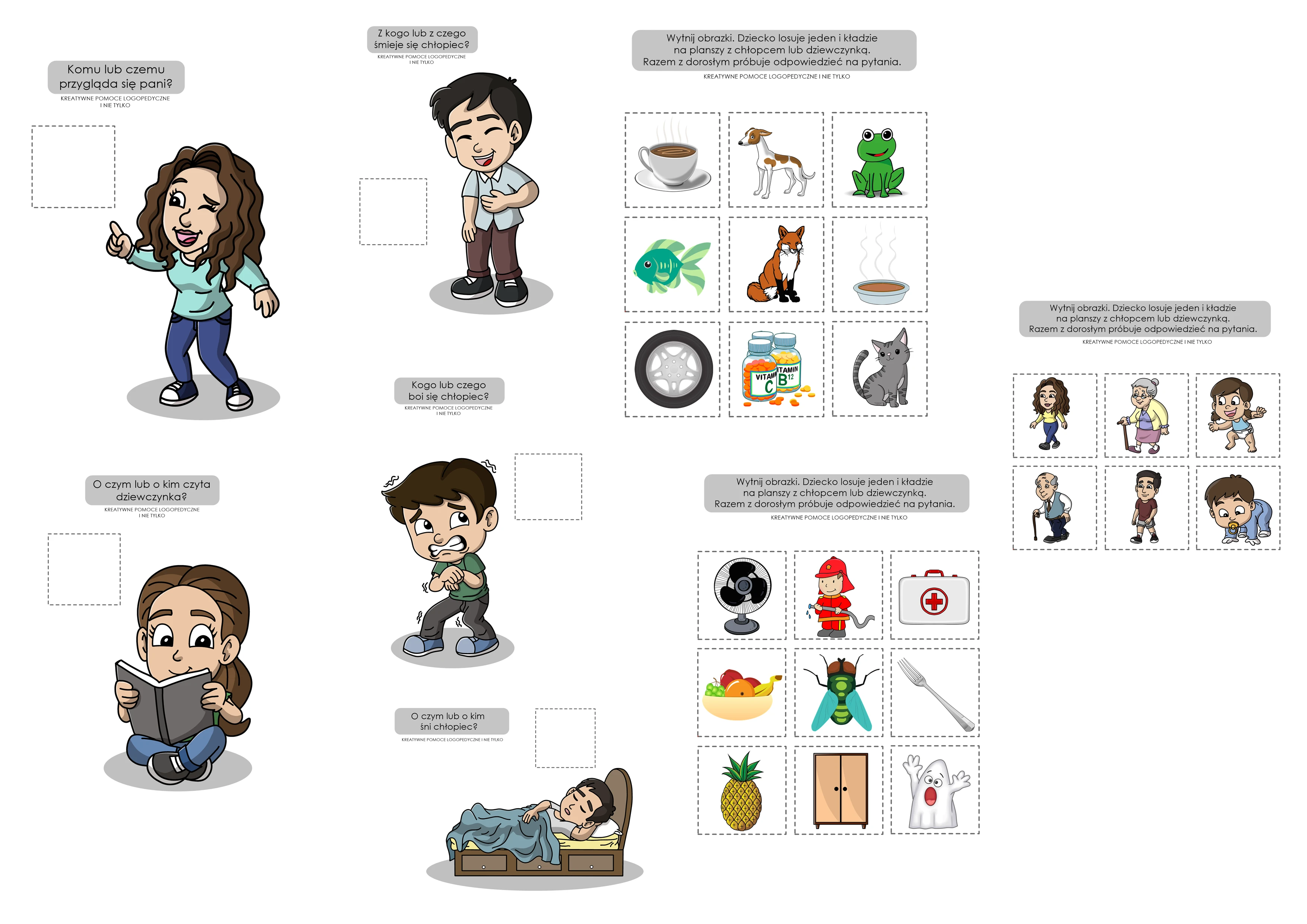 Losujemy małe obrazki, układamy je na dużych planszach i próbujemy odpowiadać na pytania. W ten sposób doskonalimy umiejętność budowania zdań, używając właściwych form gramatycznych rzeczownika. Dodatkowo można łączyć rzeczowniki z przymiotnikami i wspólnie odmieniać, np. To jest młody pies. Dziewczynka przygląda się młodemu psu.