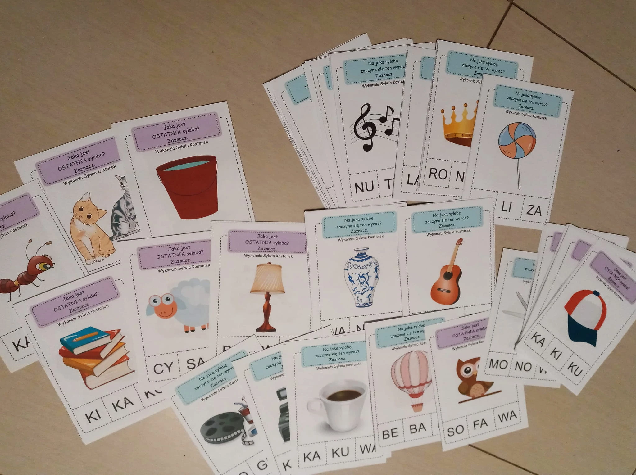 karty można wykorzystywać jako dodatek do ćwiczeń słuchowych, liczyć sylaby, wskazywać, które słowo ma ich więcej/ mniej