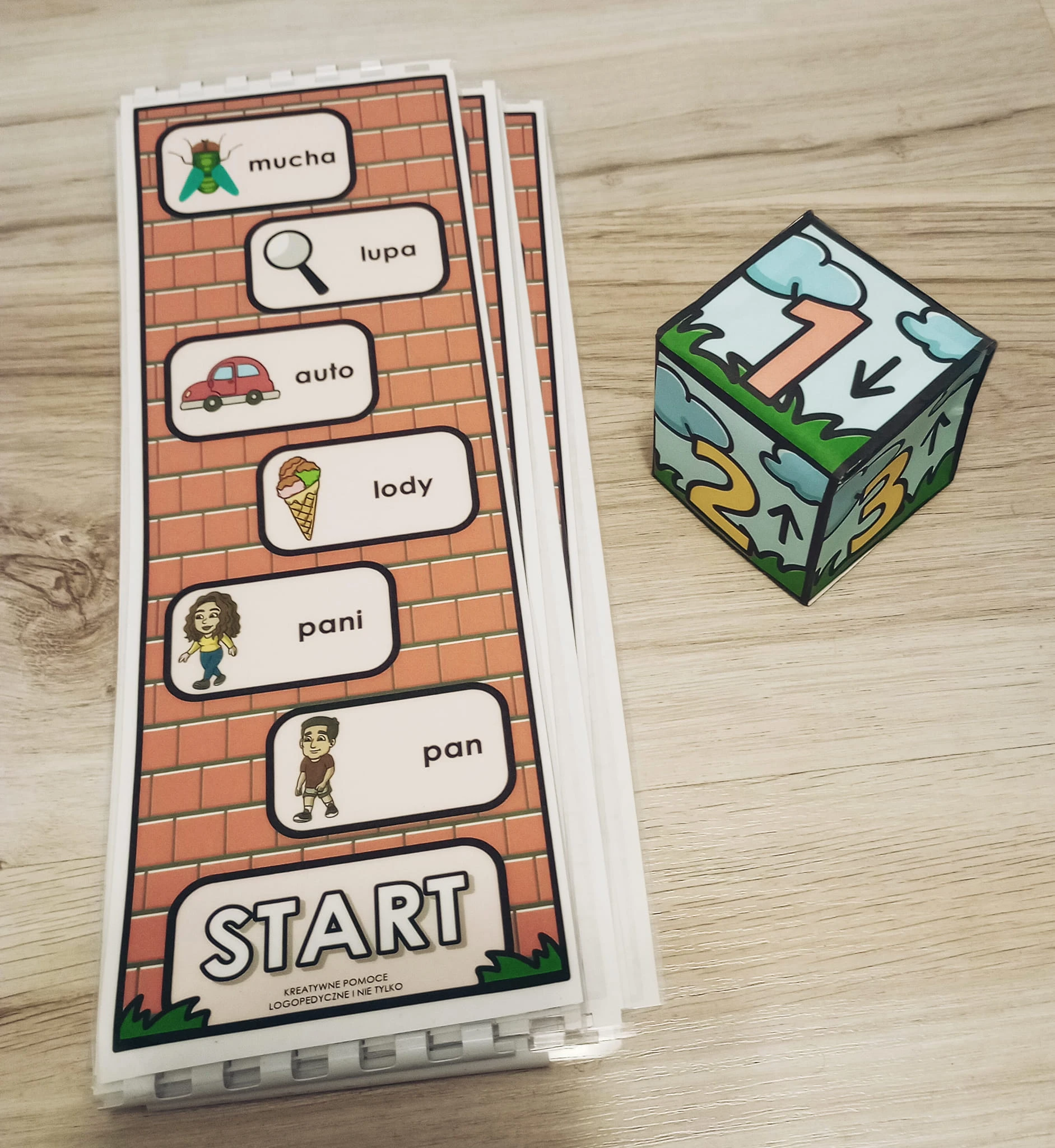 Ustawiamy pionki na starcie. Wspinamy się o tyle oczek, ile wyrzucimy (lub schodzimy w wersji z kostką do samodzielnego złożenia). Gracz na każdym polu wykonuje zadanie, np. ćwiczenie warg/ języka, nazywa obrazek (proste słowa), ćwiczenia językowe.