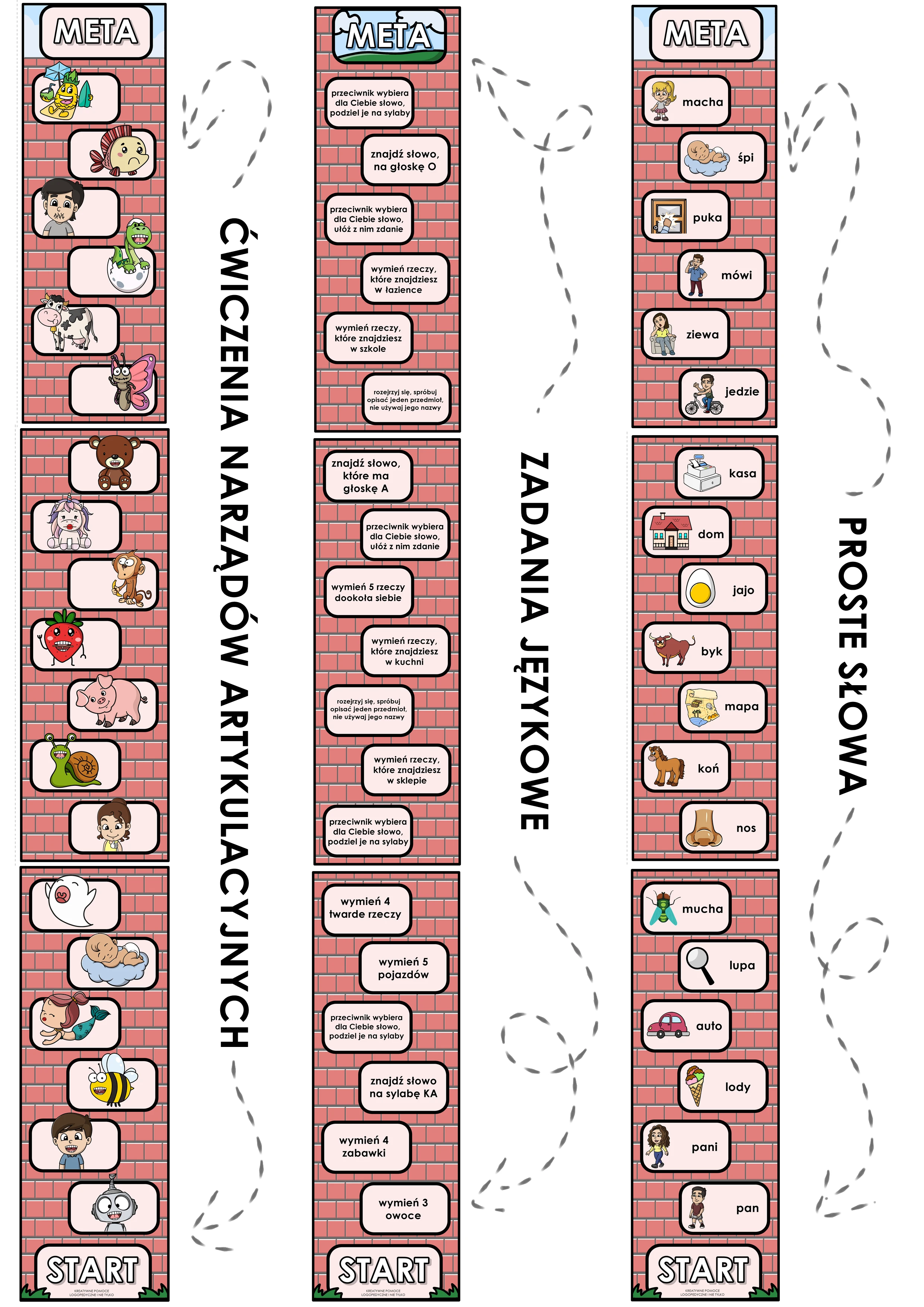 Drukujemy, wycinamy i łączymy ze sobą wybrany zestaw (ćw. aparatu artykulacyjnego, zadania językowe lub proste słowa). Tworzy nam się wysoki mur do wspinania.