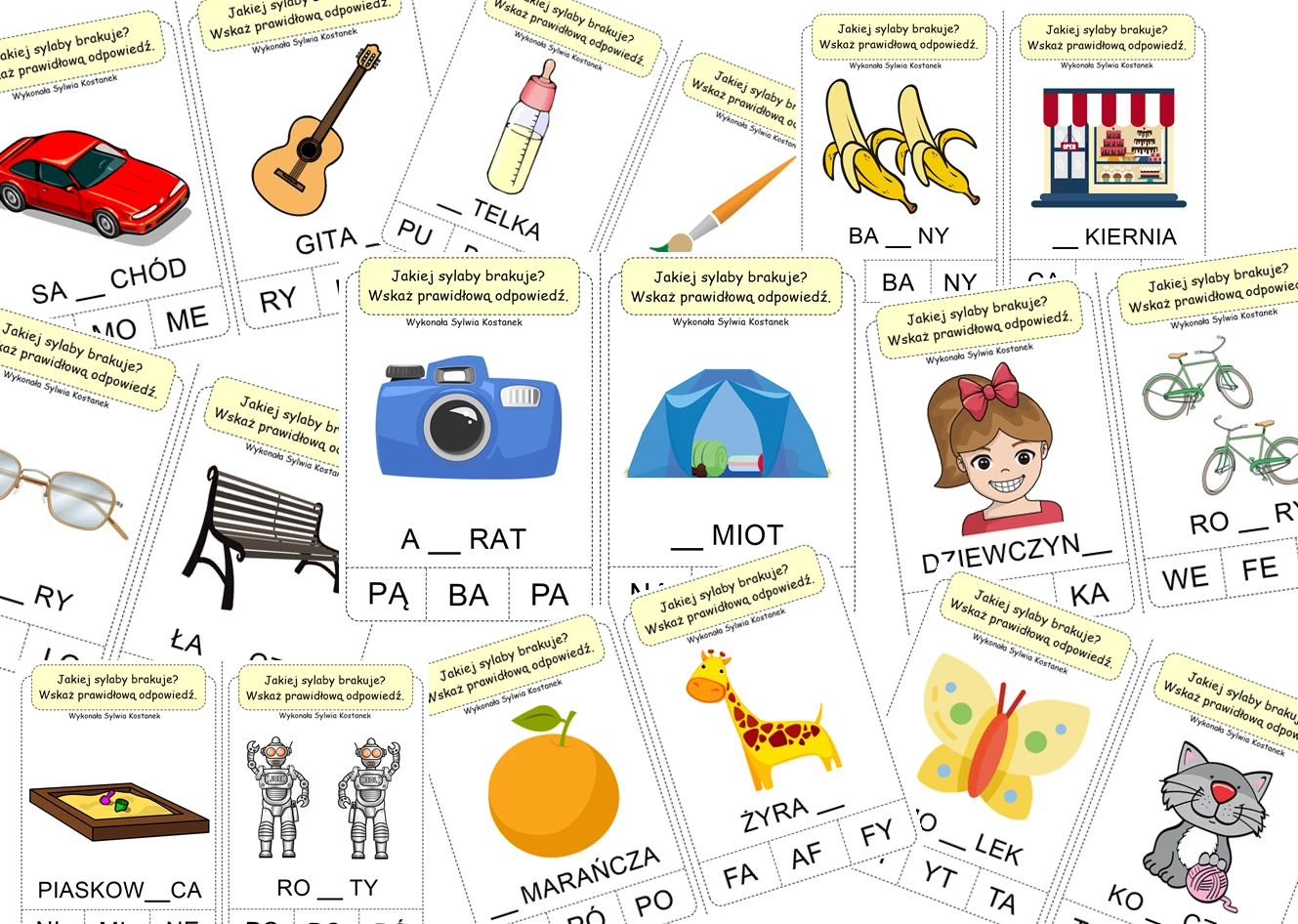 karty można wykorzystywać jako dodatek do ćwiczeń słuchowych, liczyć sylaby, wskazywać, które słowo ma ich więcej/ mniej