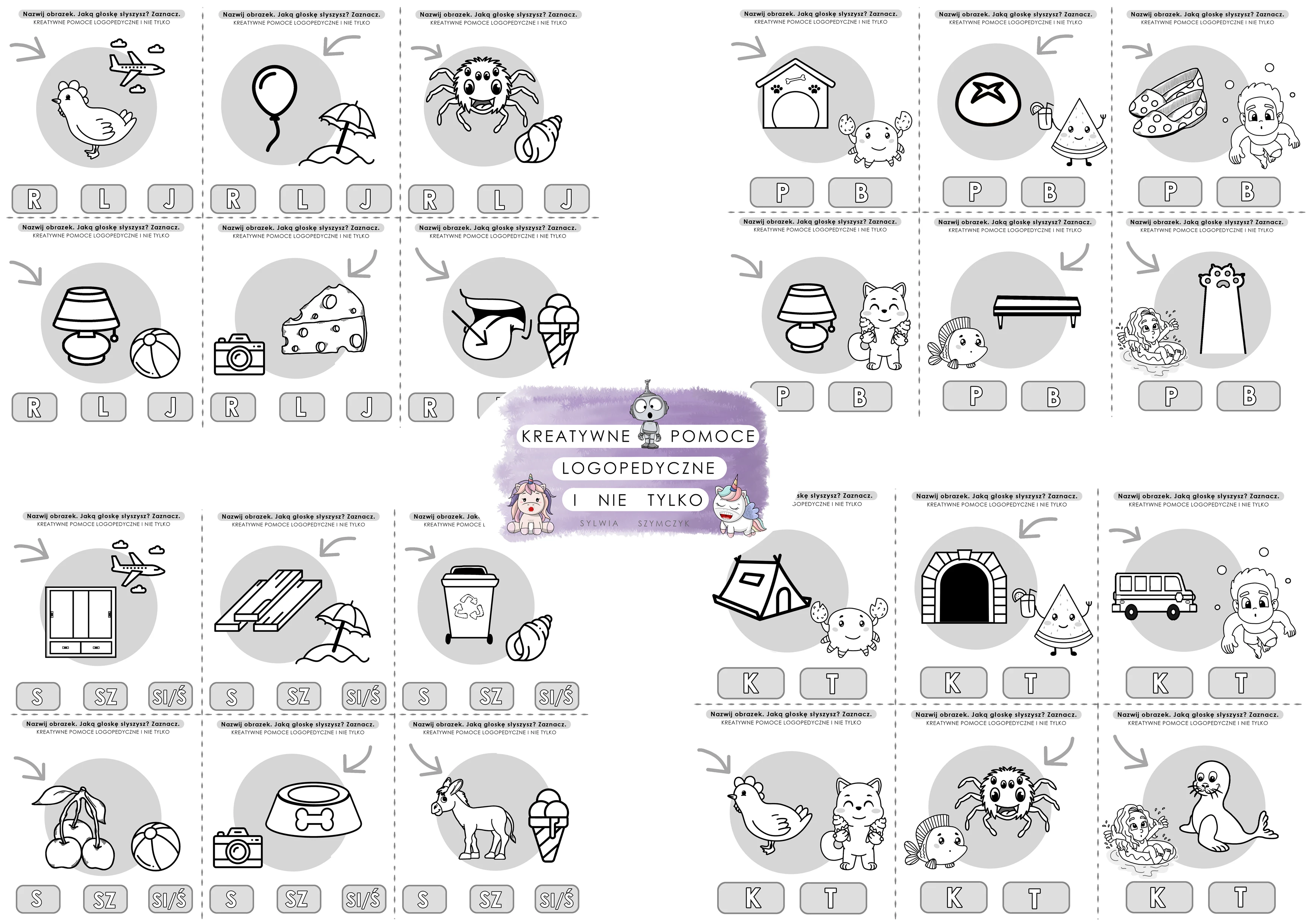 Zestaw czarno-białych kart do różnicowania słuchowego trudnych głosek.