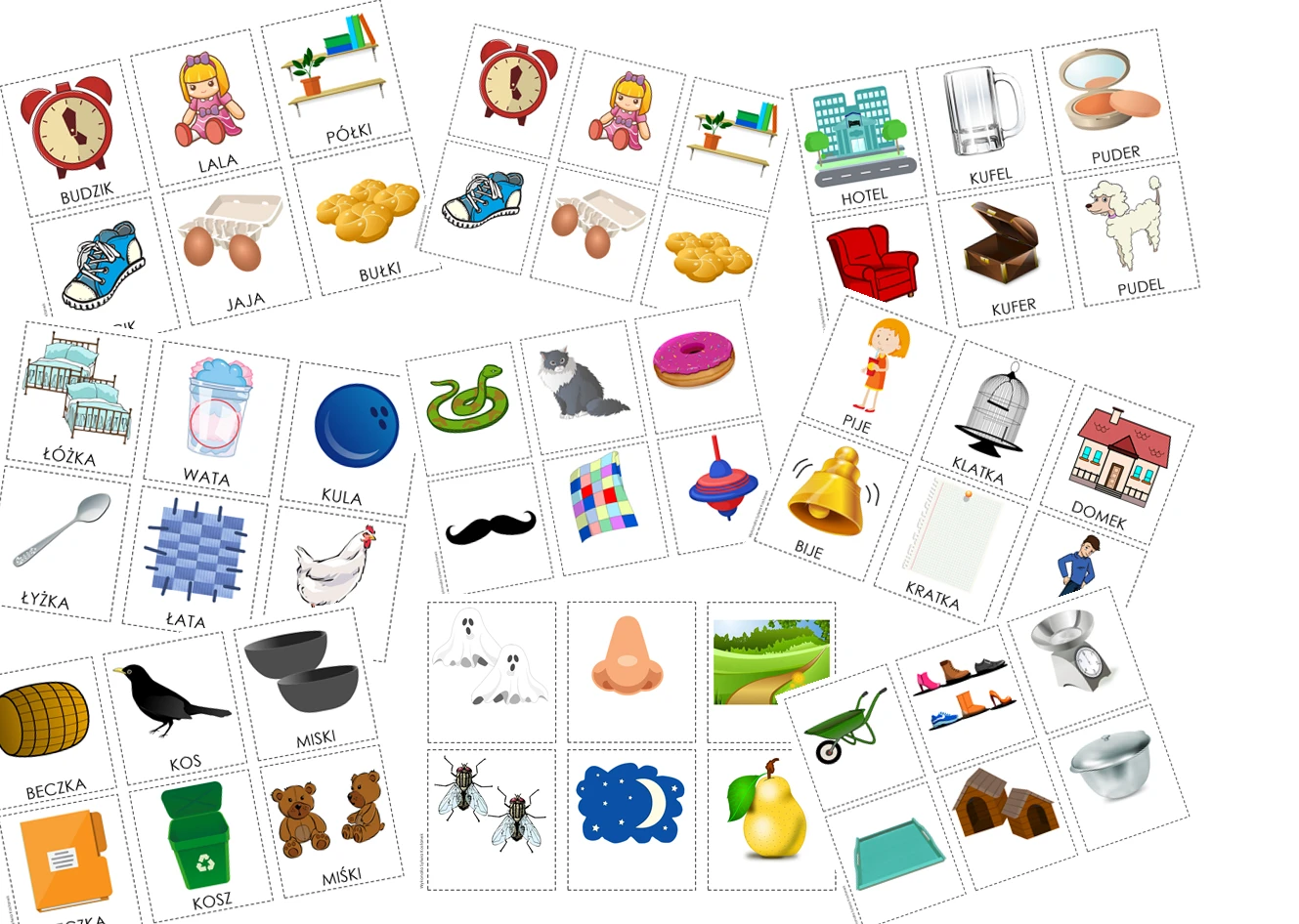 Na kartach znajdują się obrazki z podpisami i bez (można je wykorzystać do gry w memory, Piotrusia) -
