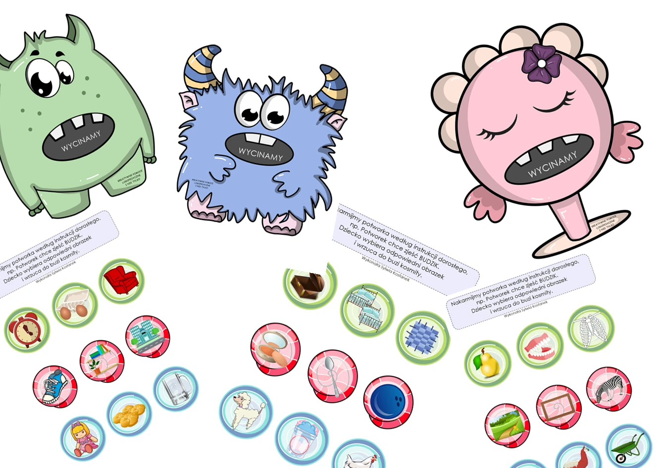 Nakarm POTWORKA- kosmici chcą zjeść cukierki, ale jakie? Dorosły rozkłada 2 cukierki z paronimami i nazywa obrazek- dziecko słucha i wrzuca do paszczy potworka smakołyk.