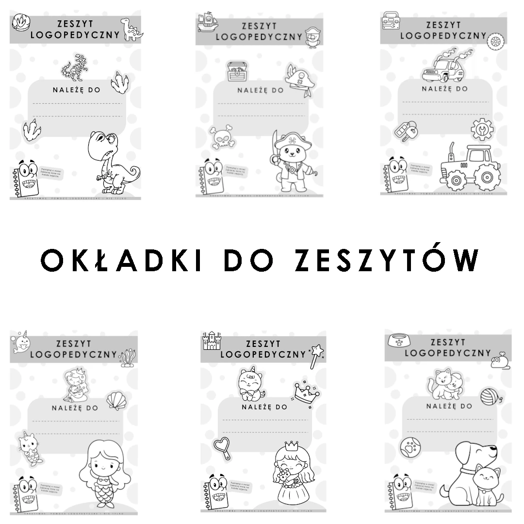 - wklejki - okładki do zeszytu logopedycznego (dziecko ma możliwość pokolorowania ich, wersja dla dziewczynek + wersja dla chłopców), wklejki do zbierania plusów/ stempli za aktywność na zajęciach, wklejki motywacyjne (wersja dla dziewczynek + wersja dla chłopców)