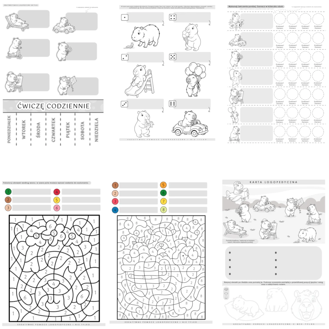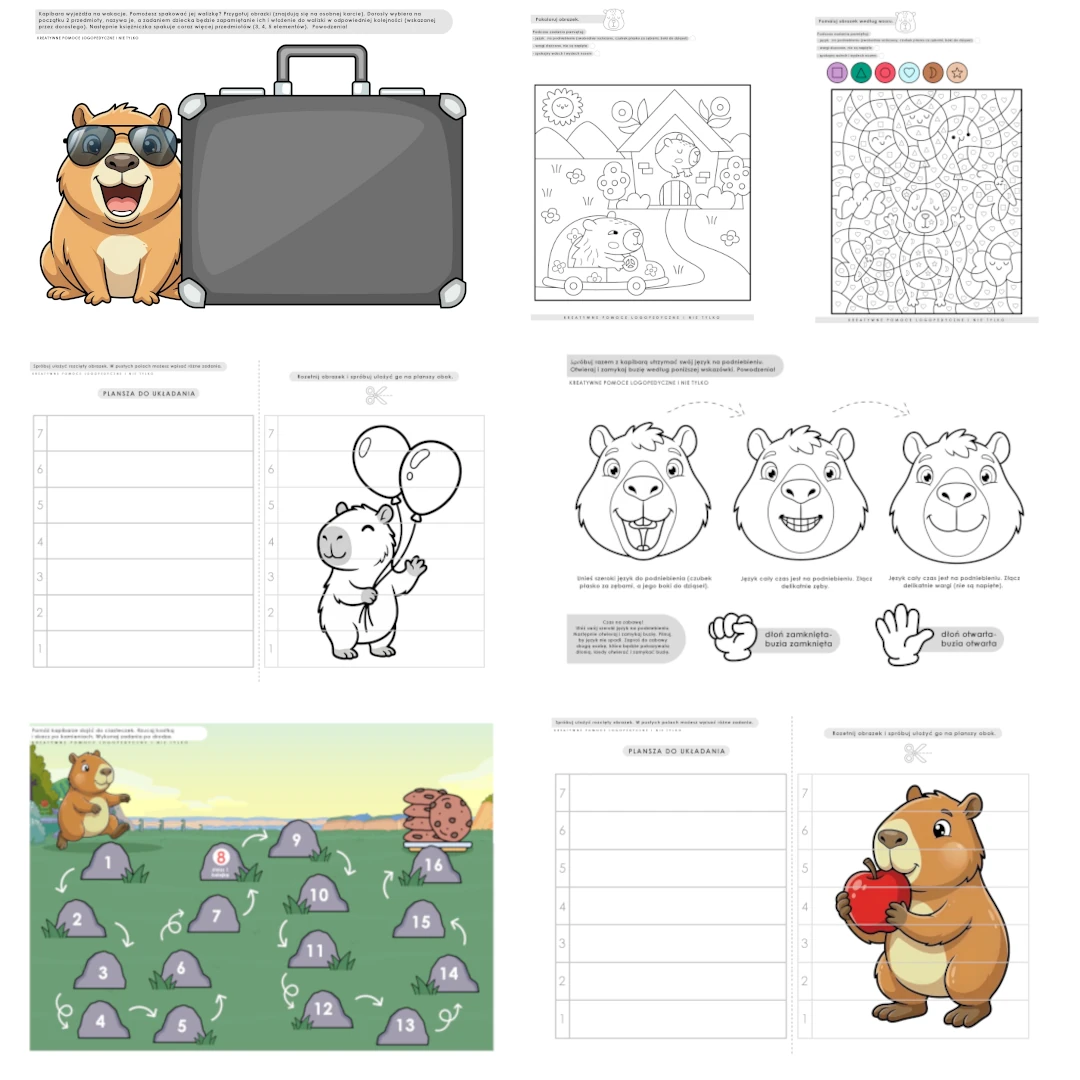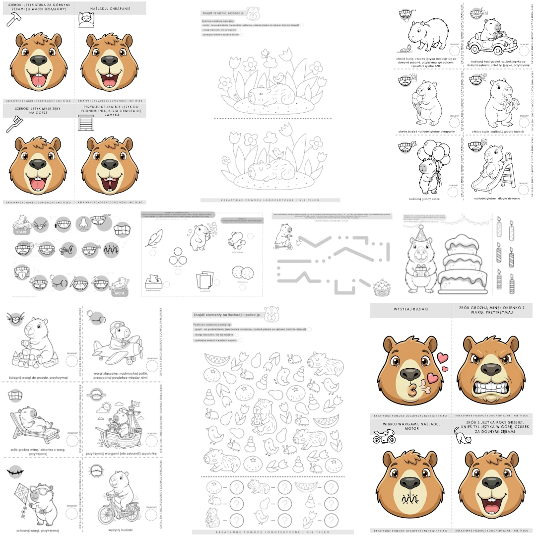Rozbudowany zestaw materiałów do pracy terapeutycznej i domowej, który łączy ćwiczenia miofunkcjonalne, zadania językowe oraz zabawy rozwijające w atrakcyjnej, przyjaznej dla dzieci formie. Motyw kapibary zwiększa zaangażowanie dziecka i ułatwia systematyczną pracę.