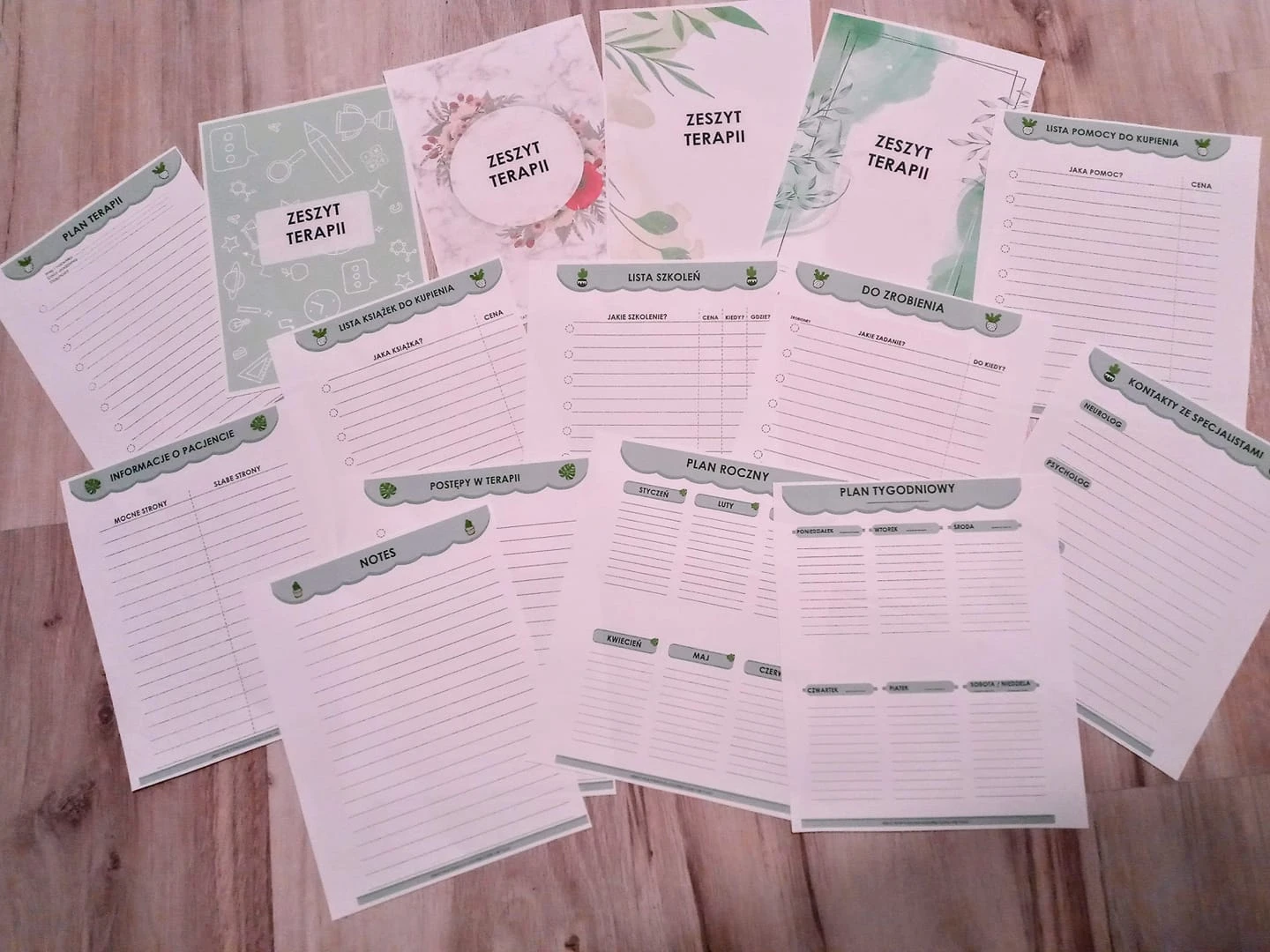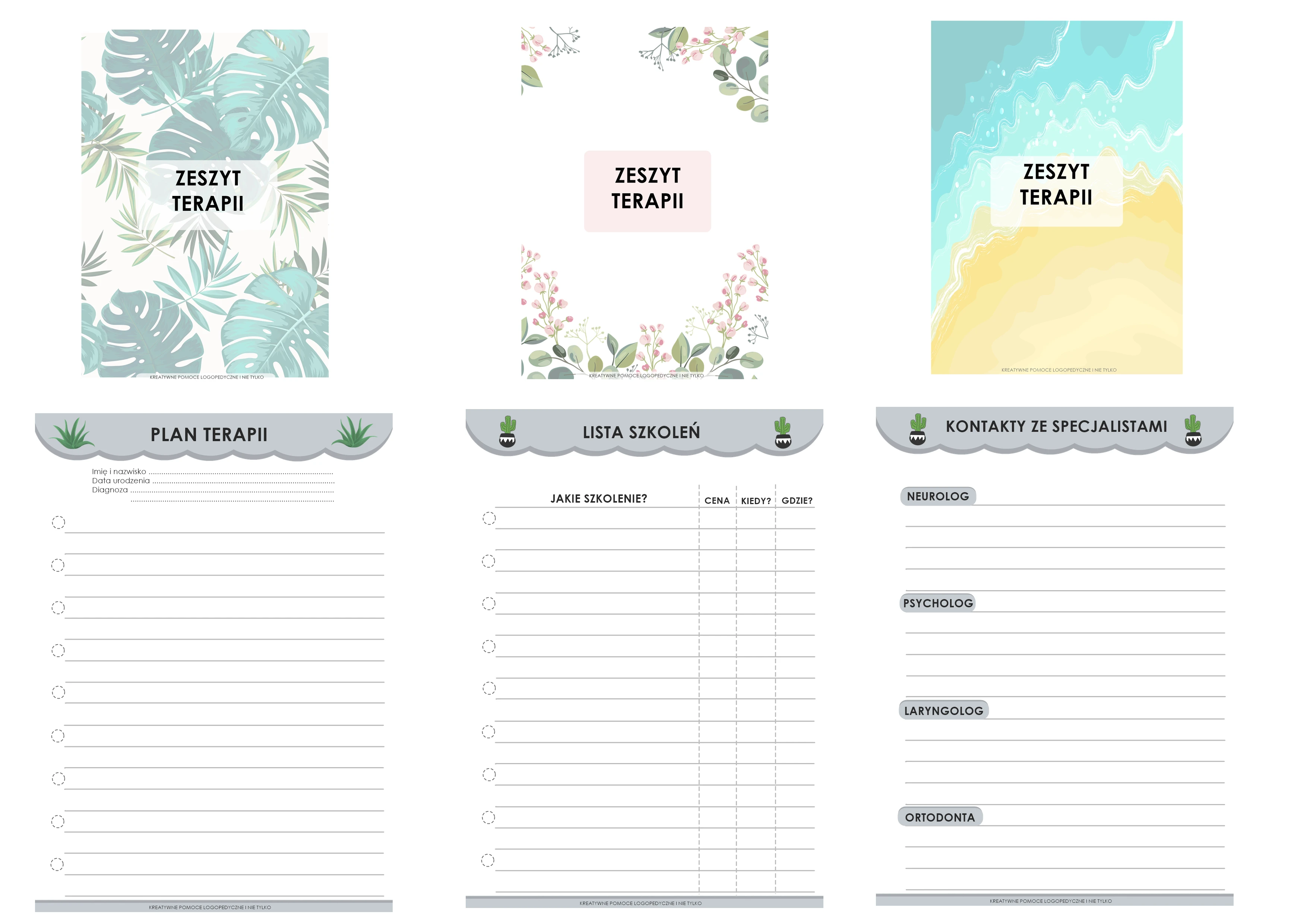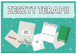 Zeszyt terapii to zestaw kart, które pomogą Ci w organizacji i planowaniu. Ich zaletą jest możliwość wielokrotnego druku według własnych potrzeb. Mogą tworzyć zeszyt (zszyty zszywaczem, włożony do skoroszytu/ segregatora) lub odrębne notatki powieszone na tablicy nad biurkiem.